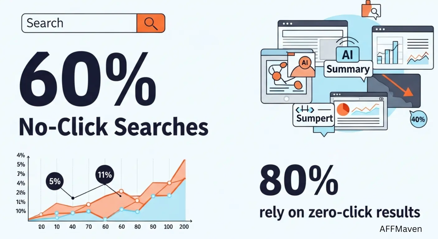 وفقا لدراسة 2024 من قبل سبارك تورو وداتوسينتهي ما يقارب 60% من عمليات البحث على جوجل الآن دون نقرة. وهذا يعني أنه مقابل كل 10 أشخاص يبحثون عن "أفضل برامج التسويق عبر البريد الإلكترونيستة منهم لا يزورون أي موقع إلكتروني على الإطلاق. إنهم يقرؤون ملخص الذكاء الاصطناعي فقط ثم ينتقلون إلى غيره.